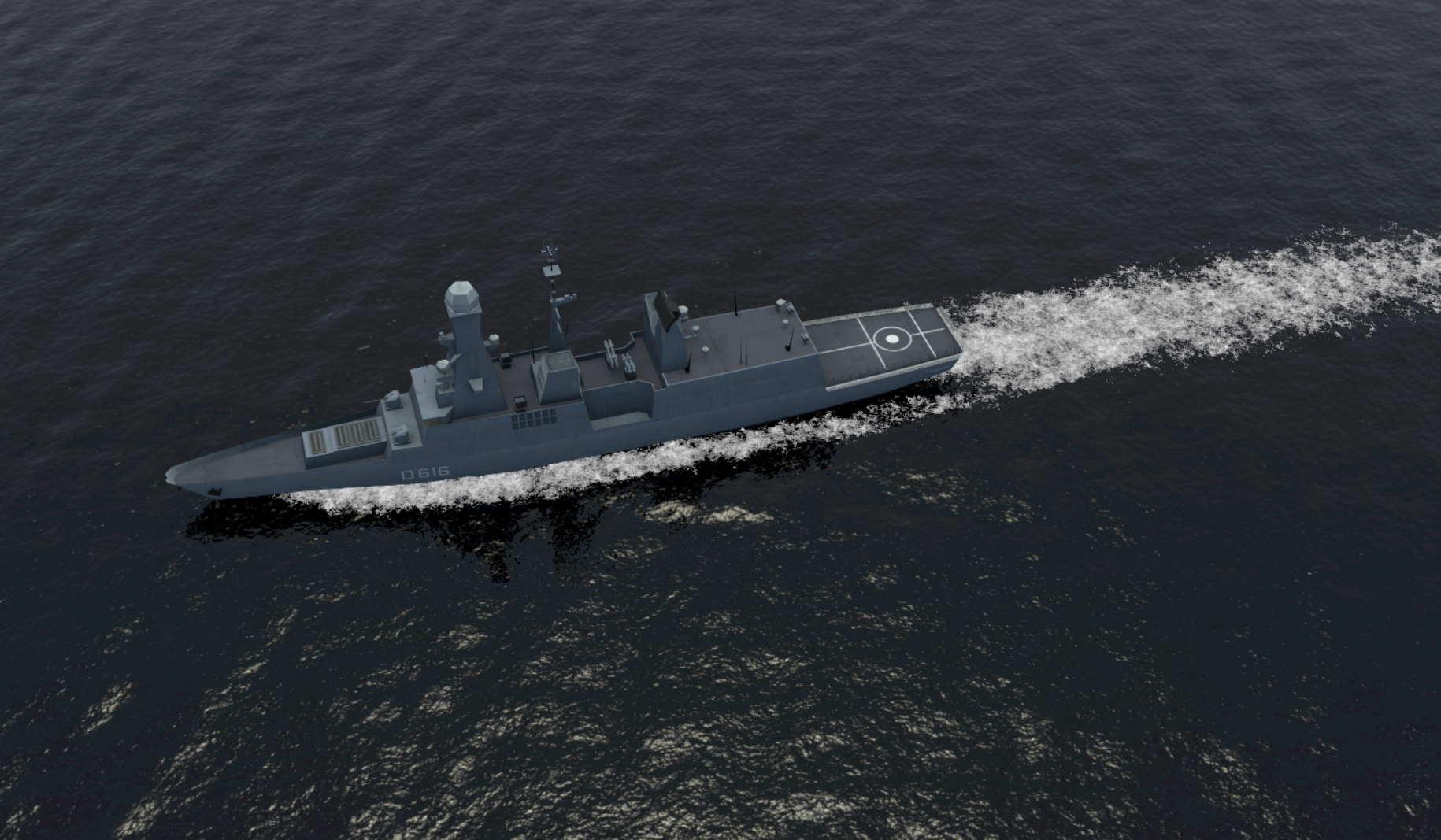 A geo-typical sea area (South-East of France) with Cliffs, beaches, harbor, ships with wakes, waves with whitecaps, several ships (static & moving)